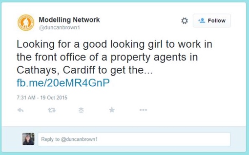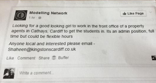 A longer version of the advert appeared on Facebook, saying: “Looking for a good looking girl to work in the front office of a property agents in Cathays, Cardiff to get the students in.”