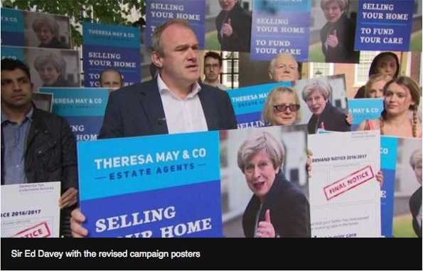Lib Dem candidate Sir Ed Davey said there were ways of funding social care that would not involve “setting up May & Co estate agents to come after your home”.
