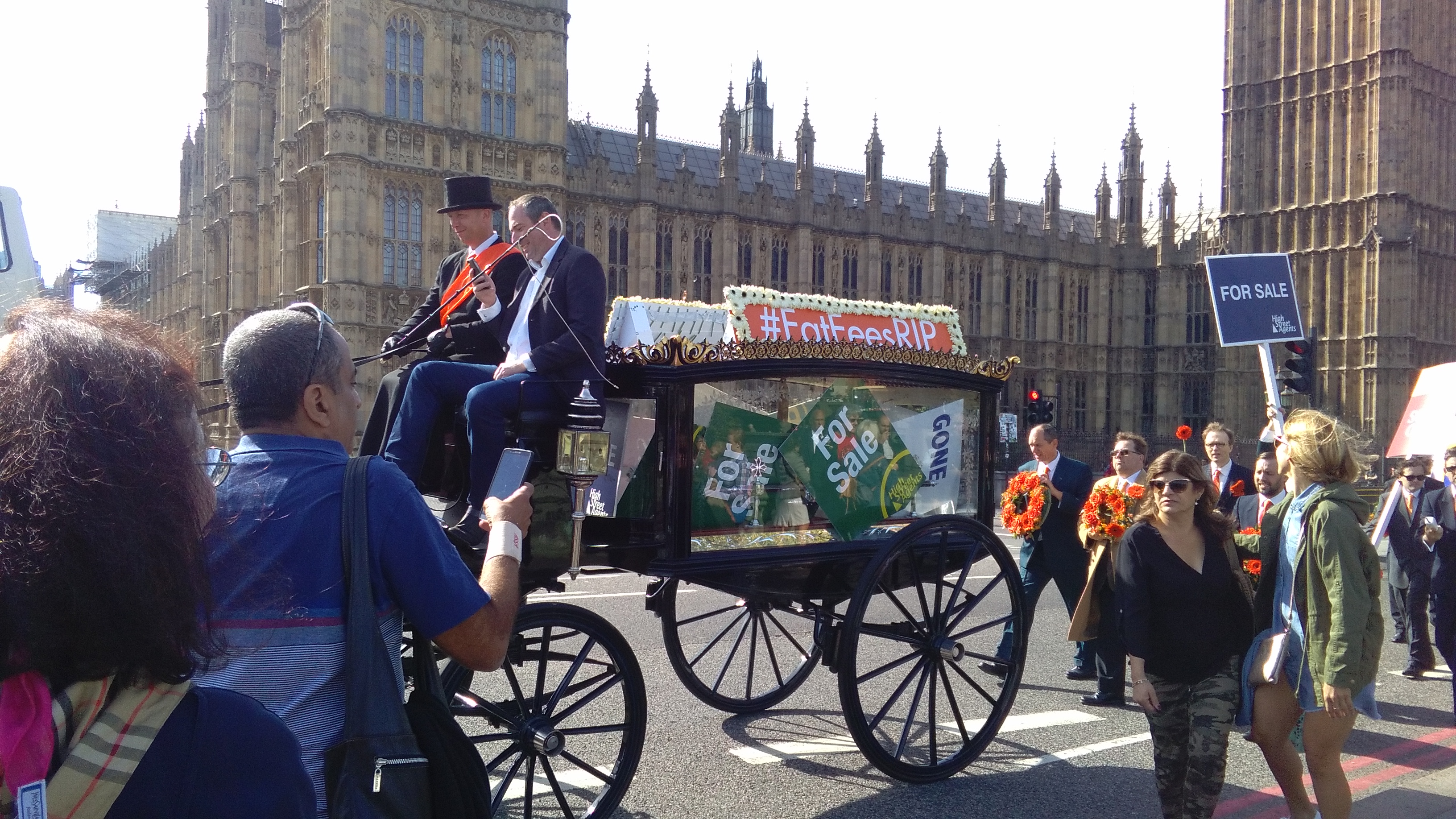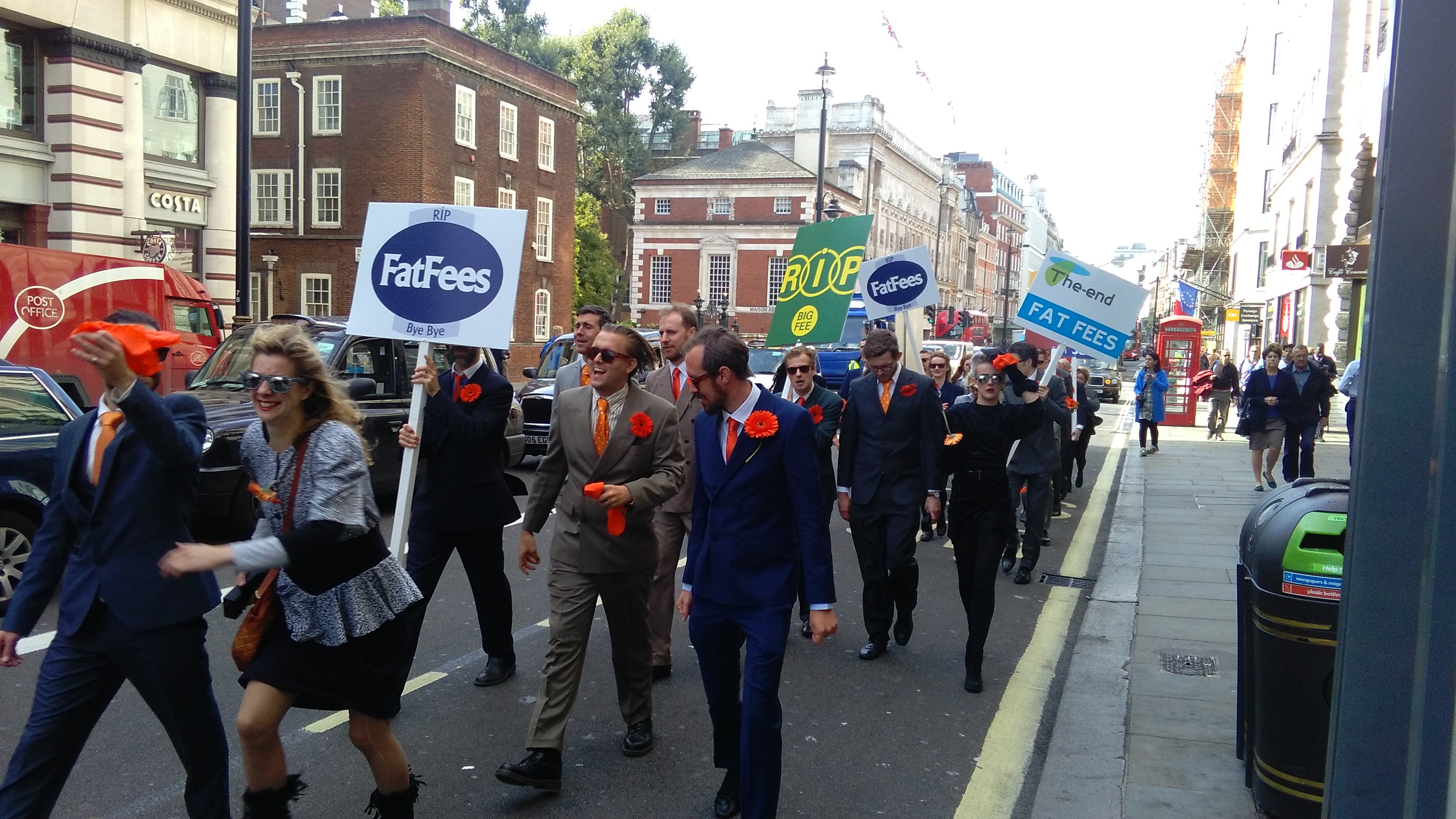 Some of the ‘agents’ carried wreaths, while others held boards proclaiming ‘RIP Fat Fees’.