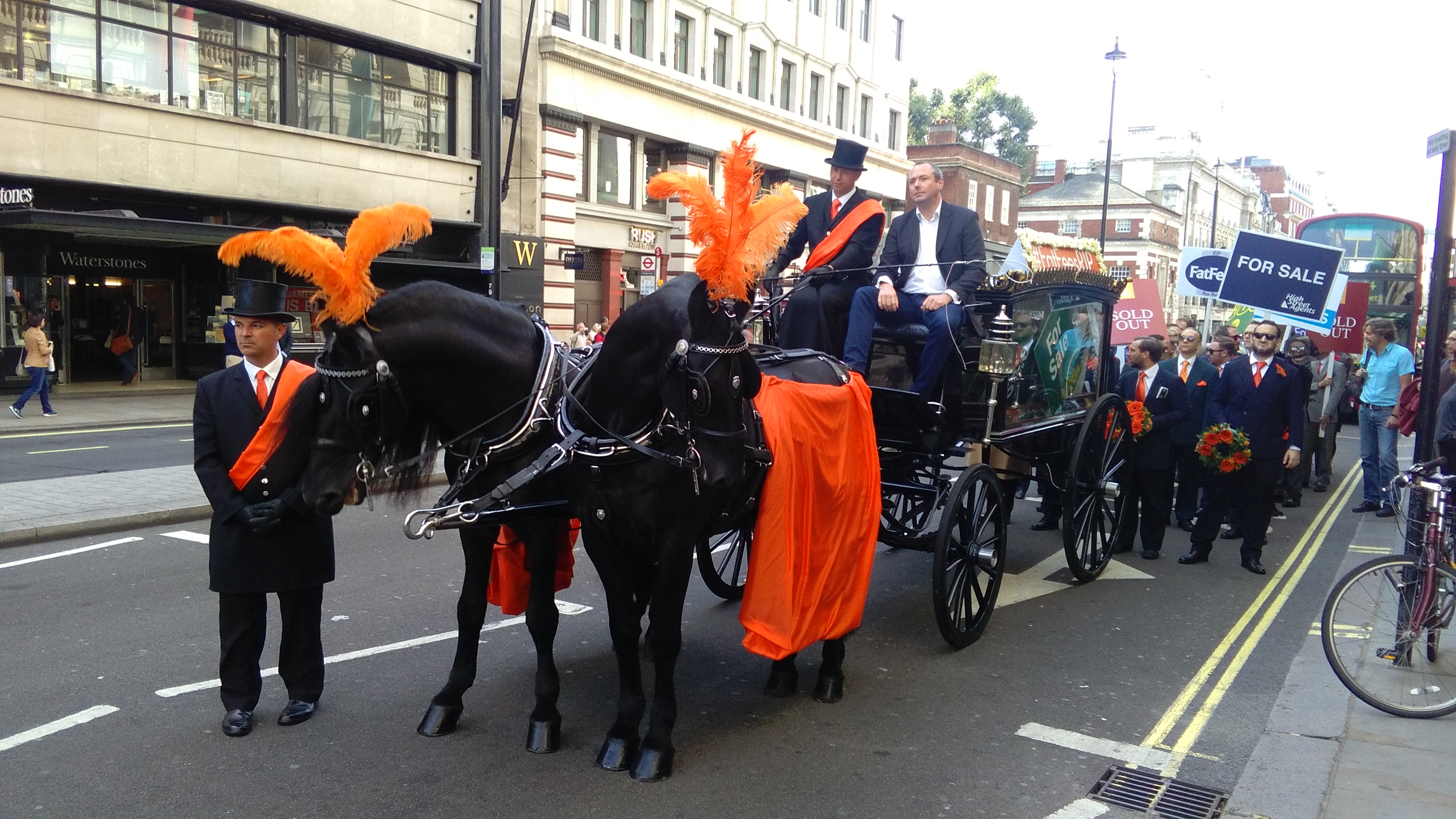 Ellice marched at the front or sat in the hearse as ‘chief mourner’, while ‘estate agents’ in pin-striped suits carried mobile phones clasped to their ears, crying “it’s the end”.
