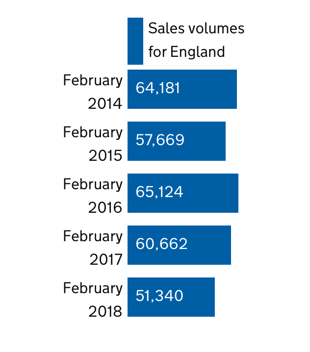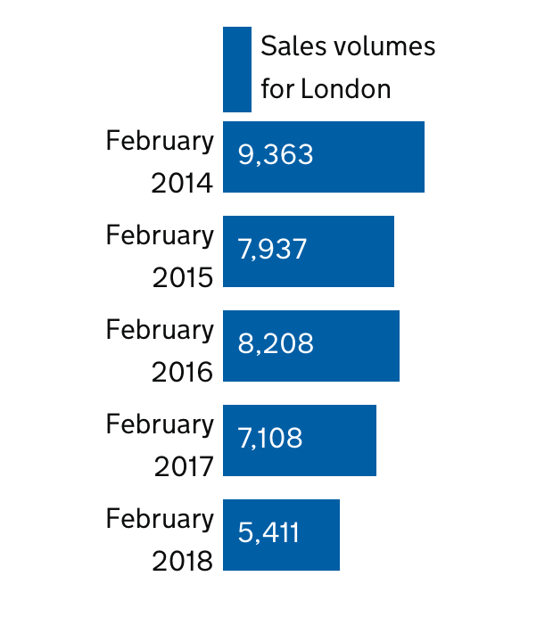 In England, sales stood at 51,340, down from 60,662 in February last year. In the south east, sales were down almost 20%, and in London there was the biggest annual decline, with transactions at 5,411, down from 7,108 in February 2017.