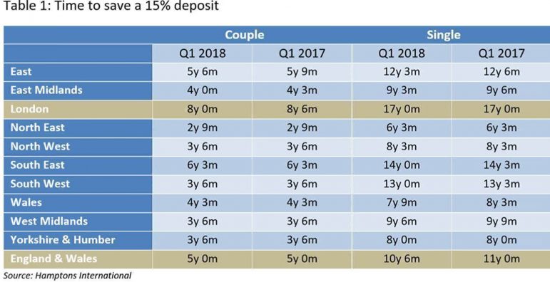 The amount of time is slightly down on research from last year that showed it would take 11 years for a single person and 10 years and six months for a couple who started saving in the first quarter of 2017. Hamptons International said this reflects slower house price growth and a rise in incomes.