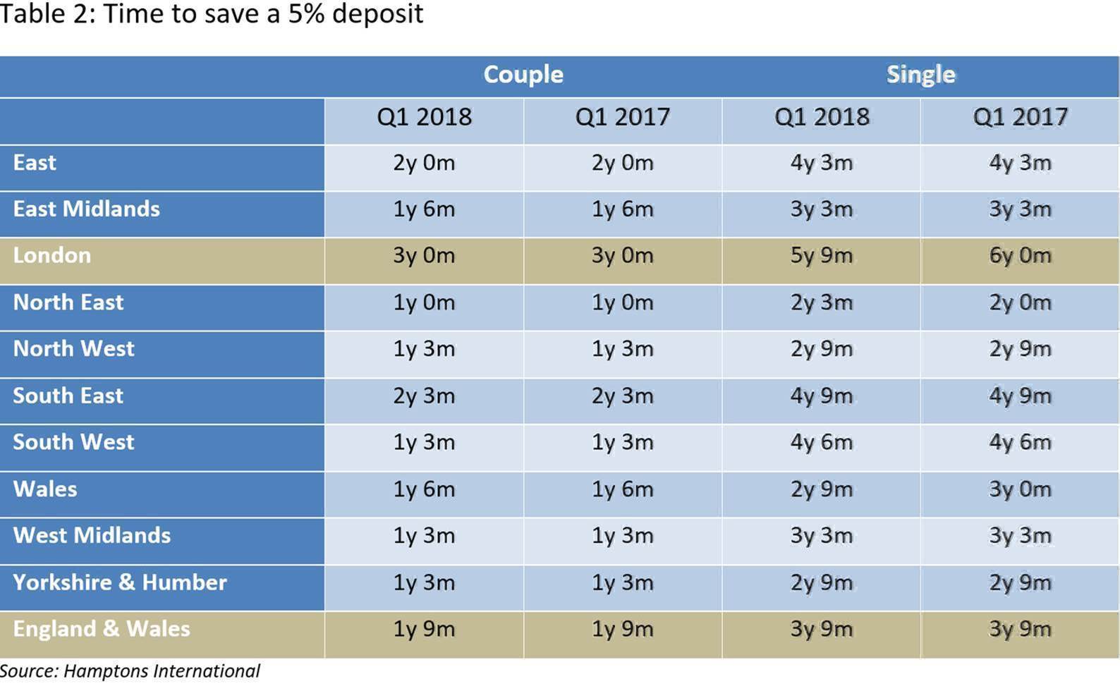 The amount of time is slightly down on research from last year that showed it would take 11 years for a single person and 10 years and six months for a couple who started saving in the first quarter of 2017. Hamptons International said this reflects slower house price growth and a rise in incomes.