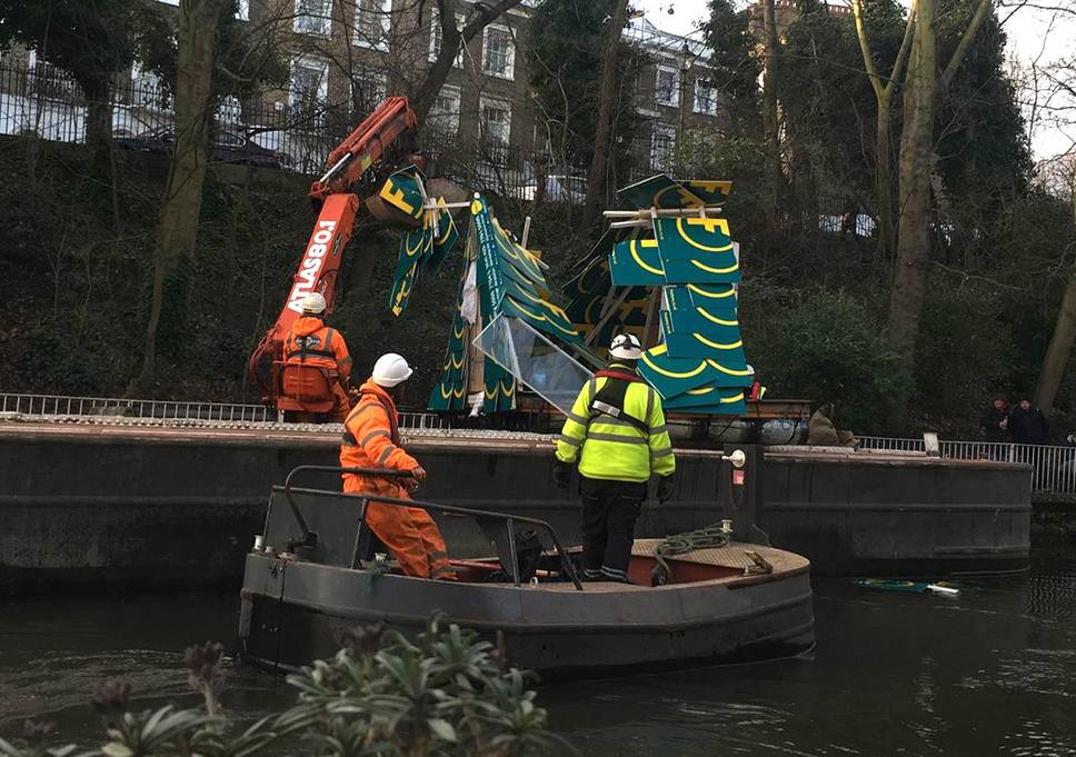 Its roof was made up of the distinctive yellow and green boards of London estate agent Foxtons and the structure floated on empty beer kegs borrowed from nearby pubs.