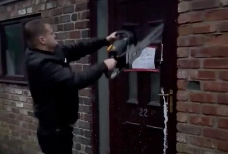 Furious landlord filmed using a chainsaw to cut through door to evict tenant