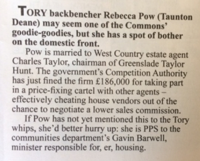 It concludes: “If Pow has not yet mentioned this to the Tory whips, she’d better hurry up: she is PPS to the communities department’s Gavin Barwell, minister responsible for, er, housing.”