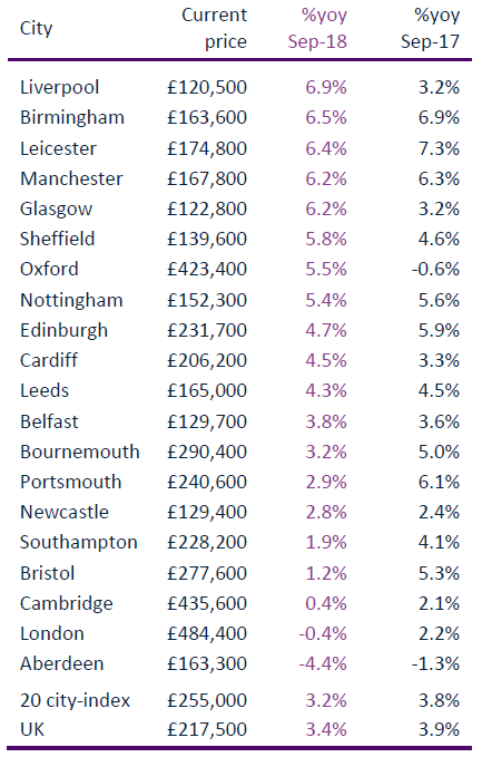 Figures from property data company Hometrack show average house prices in the top 20 biggest UK cities were up 3.2% annually in September to £217,500.