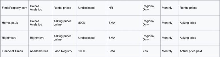 “Prices are therefore apple and pear comparisons in some cases so prices cannot be cross-referenced. The trend in price rises/falls can be compared amongst all, but some are leading indicators, some lagging ones, and some small sample sizes.