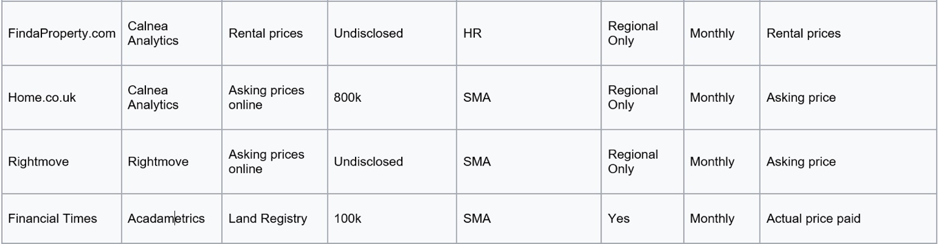 “Prices are therefore apple and pear comparisons in some cases so prices cannot be cross-referenced. The trend in price rises/falls can be compared amongst all, but some are leading indicators, some lagging ones, and some small sample sizes.