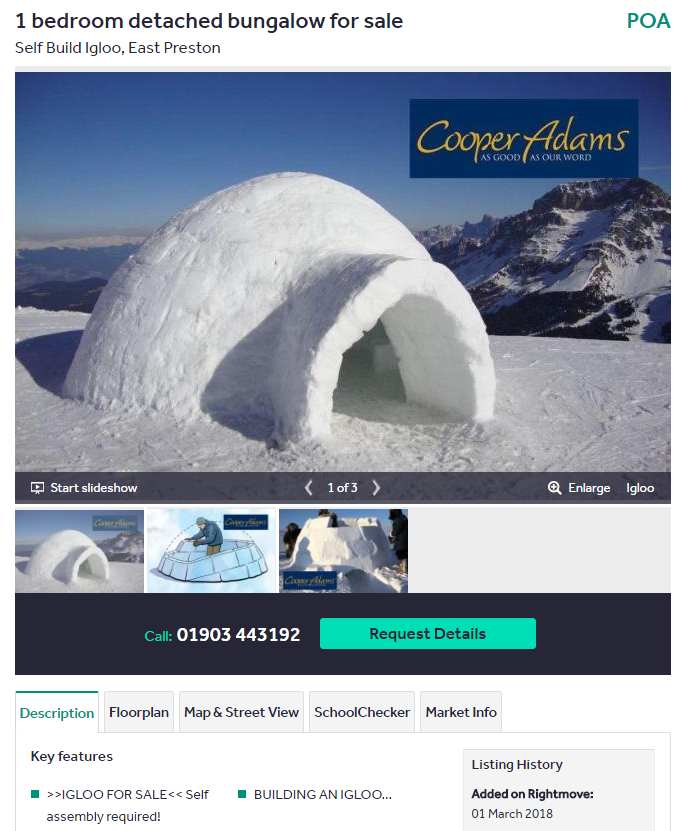 Sussex agent Cooper Adams is advertising a well-appointed igloo for sale on Rightmove.