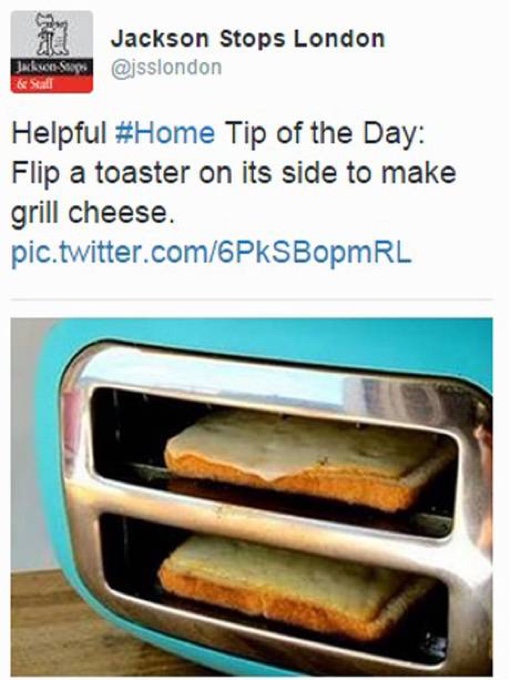 Jackson Stops London suggested to its 700 followers that a good way of cooking cheese on toast was to turn the toaster on its side.