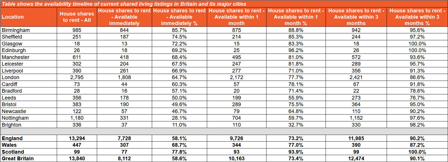 The figures are based over 13,000 shared living listings across 15 cities*. They show that only 58.6% of rooms being advertised are listed as being available for immediate move-in. and that over a quarter (27%) still won’t be available for at least one to three months, meaning many tenants need to plan their move well in advance, or relocate to a new city.