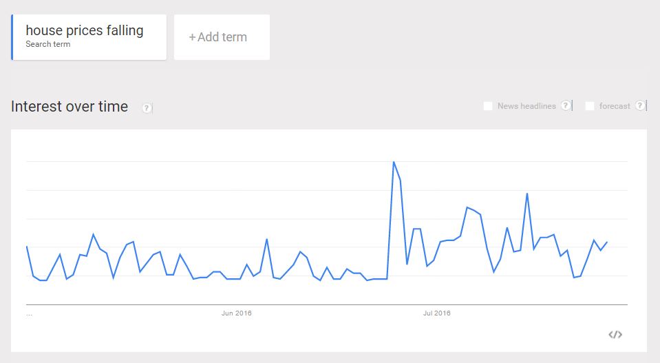 The proportion of searches in the UK for house prices falling also peaked the day after the referendum, but there does seem to have been more interest, with the relative figure reaching 63 earlier this month.
