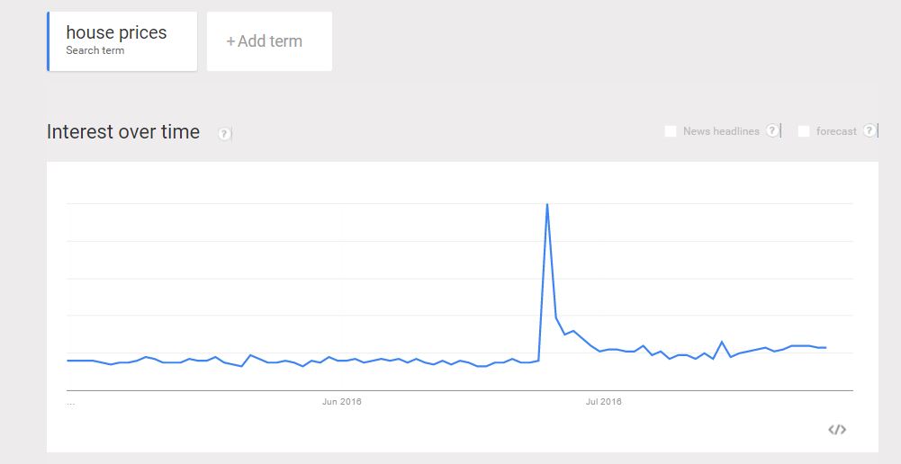 Searches for house prices peaked relative to all searches for the term over the past month on June 24, the day after the EU vote, but has since levelled off.
