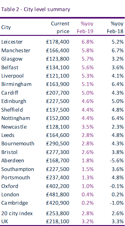 Average prices across the UK’s 20 largest cities increased by 2.8% in the year to February, Zoopla said.