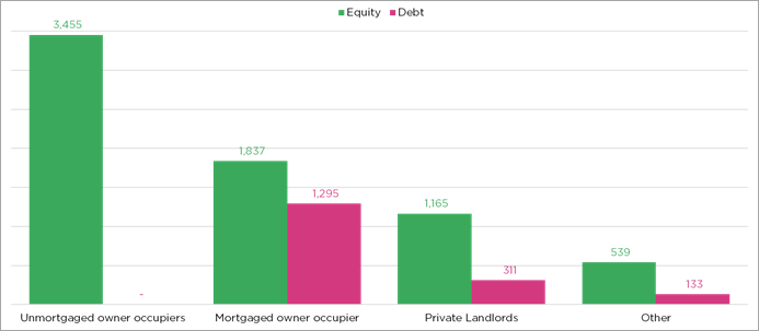 Almost half of the UK’s £7trn net housing wealth (£3.45trn) is held by unmortgaged owner occupiers.