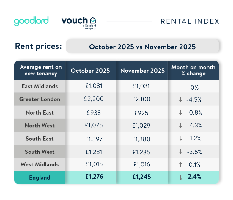 Average rents across England decreased by 2.4% in November, falling from £1,276 in October to £1,245. This marks the fourth month of declines since the peak in July, when average rents reached £1,496.