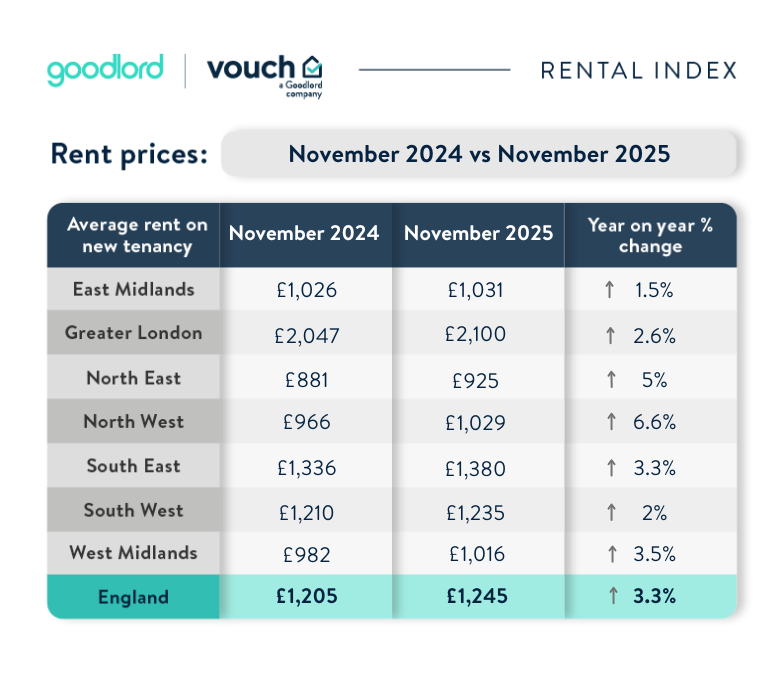 Continuing the trend seen last month, the pace of year-on-year rental inflation is climbing once again. Compared to November last year, average rents are up by 3.3%. In November 2025, rental averages sat at £1,245 compared to 2024’s figure of £1,205.