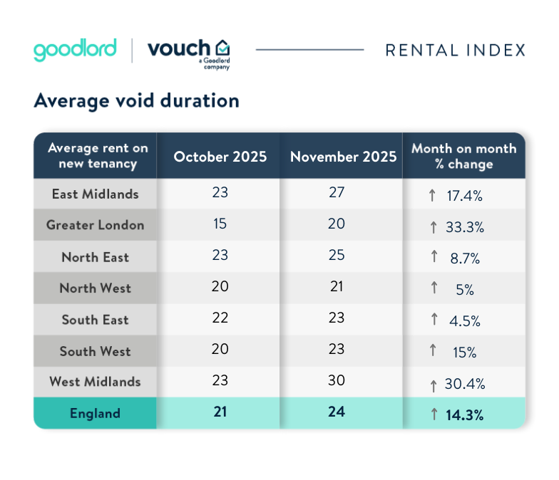 Voids lengthened during November, as you would expect to see during a month of reduced rental averages. The average void period lengthened from 21 days to 24 days across England, a rise of 14%.
