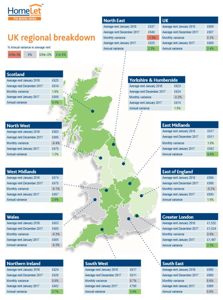 Figures from HomeLet showed a 2.4% rise in rents for the UK as a whole in January 2018 compared to the same month a year before.
