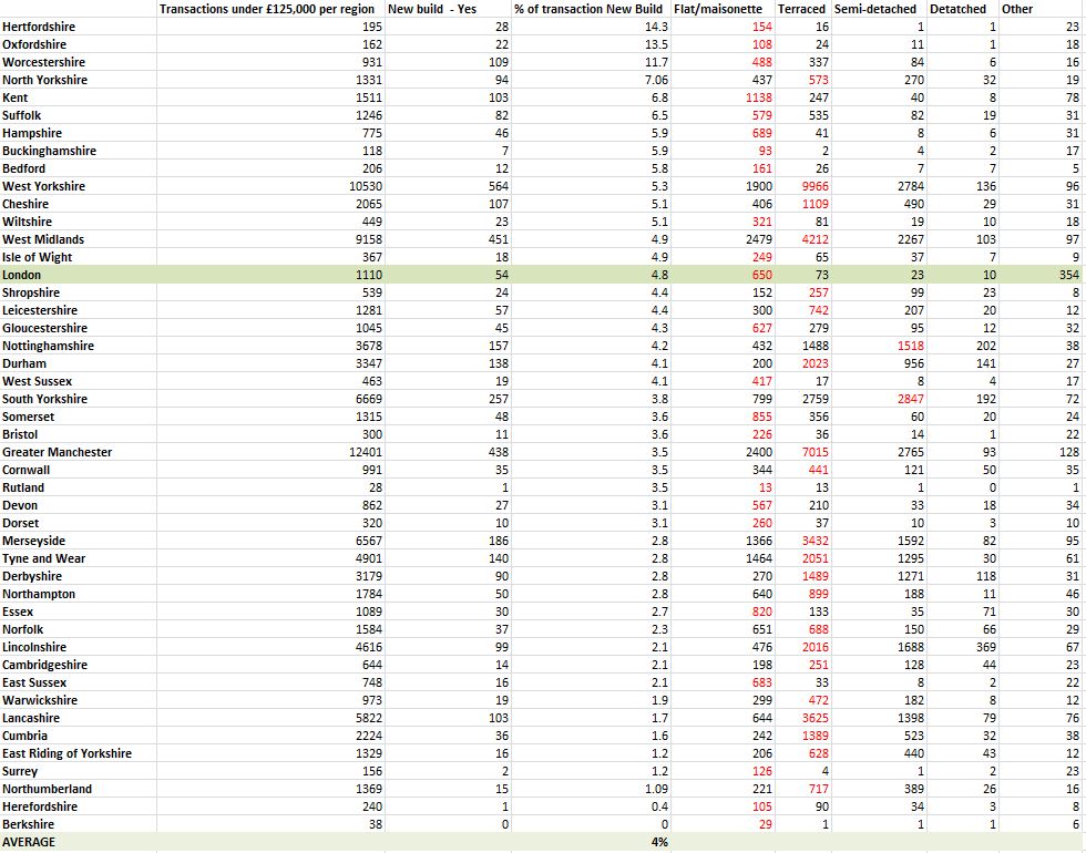 In contrast, the southern counties of Surrey and Hertfordshire had the lowest number of below Stamp Duty transactions with 1.04% and 1.3% respectively, while Greater London saw just over 1,000 homes bought for less than £125,000, just 54 of which were new-build properties.