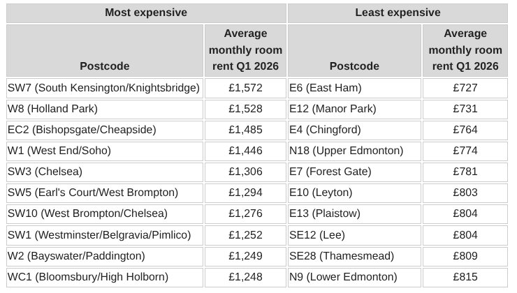 Across the capital, the average room rent now stands at £978 per month. While this is down 0.5% year-on-year, the overall figure masks variations at postcode level, according to SpareRoom.
