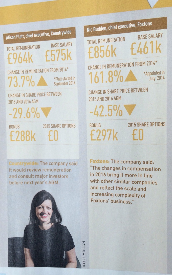 Countrywide’s Alison Platt and Foxtons’ Nic Budden are doing pretty well out of firms whose share prices, shall we say, have seen better days.