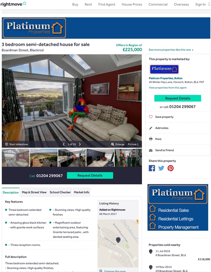 The parrot – which doesn’t even seem to be a particularly jolly polly but which might perhaps help the property fly – is here: