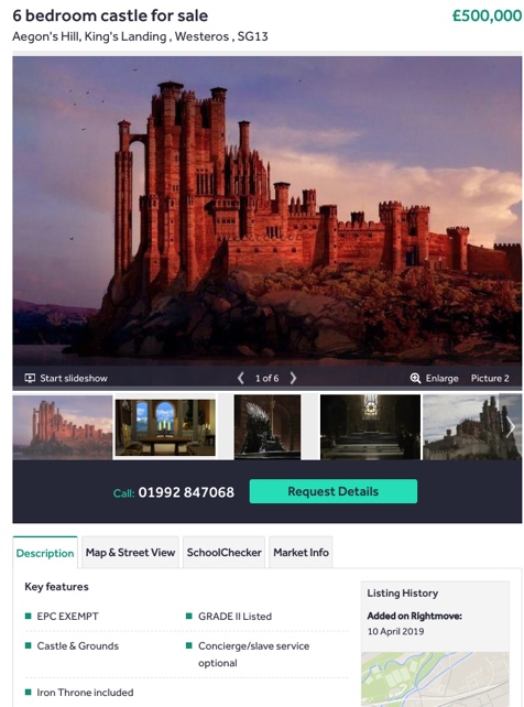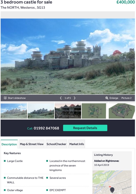 Pictures of the Week: And ahead of next week’s start of the last series of Game of Thrones, we yesterday spotted two fantastic – literally – properties on Rightmove.