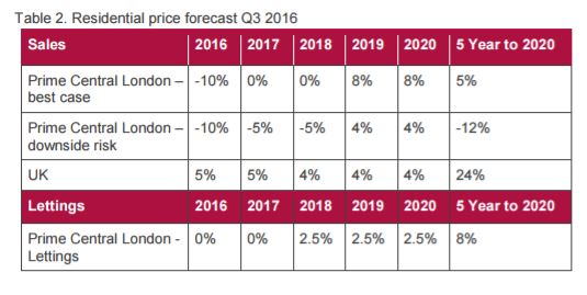 The agent is predicting that prices in prime central London will fall by 10% in 2016 and in a ‘best case scenario’ will be flat in 2017 and 2018 before returning to growth of 8% in 2019.
