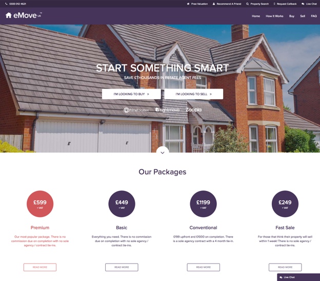 eMove UK – which uses a trademark sign above its name – lists on Rightmove and Zoopla, and charges sellers from £249 plus VAT to £449 plus VAT, with a £1,199 plus VAT package where £199 is paid upfront and £1,000 on completion.