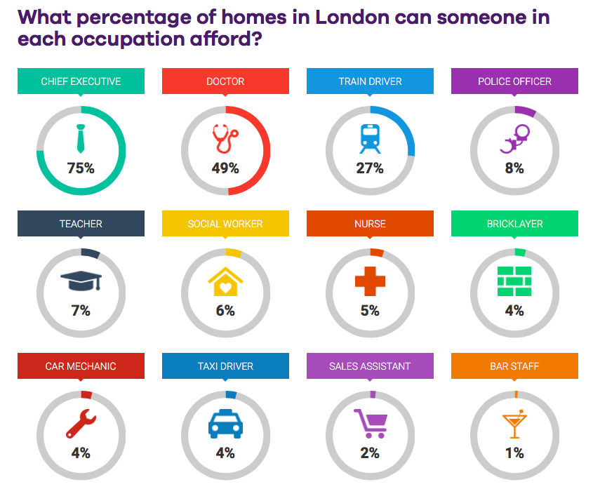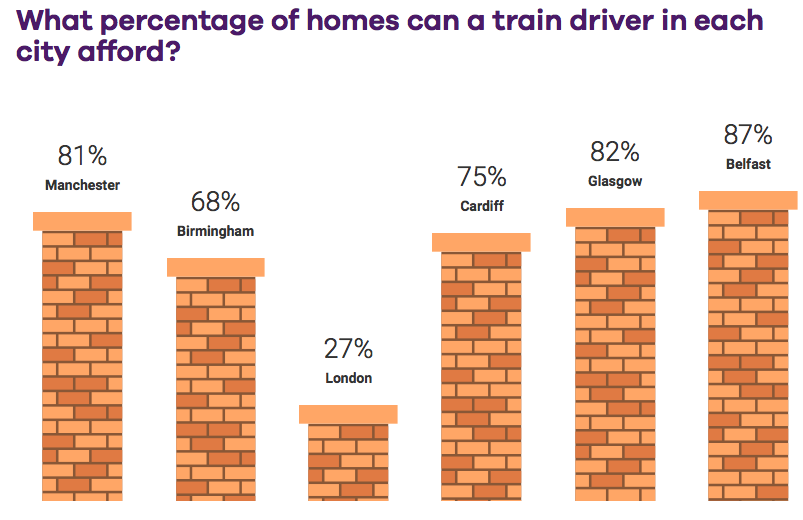In London, where police officers earn average salaries of £44,824, they can afford to buy just 8% of homes and teachers typically earning £42,359 can afford just 7%, train drivers on average salaries of £66,320, can access 27% of the city’s housing stock.