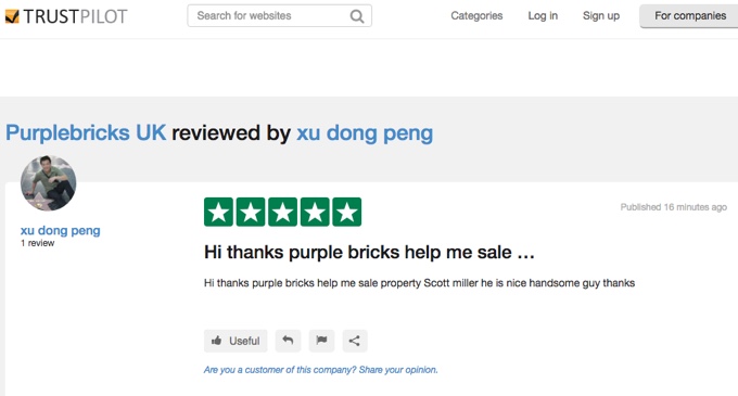 ‘We pride ourselves on the integrity of our reviews, and respect the right of all Purplebricks customers to leave their feedback, both positive and constructive. We have been unable to verify this five star review as a genuine customer of Purplebricks and as such have requested that the review is looked in to by Trustpilot Compliance.’