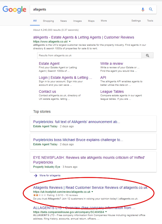 Separately, we also asked Trustpilot about the rating carried on its site about allAgents, where it has earned two stars; and also the difference in how the ‘calls to action’ on Google are phrased in allAgents and Purplebricks (see the screengrabs below).