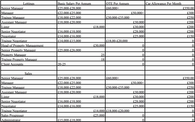As an aside, I am surprised at how low the salaries are, even for a Senior Manager and am wondering if there is a correlation between staff quality and remuneration? And then in addition to that, do the top earners break out of estate agency and move into property related industries or something totally different? This could explain why there are more positions than candidates.