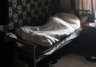 The £145,000 listing includes photos of one room in active use – complete with a figure under the duvet – while the video tour (see below) goes a step further, catching a bleary-eyed resident moving through the property and opening doors for the agent.