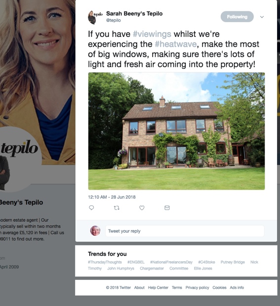 Tweet of the Week: And it’s some particularly insightful advice from TV presenter and Tepilo founder Sarah Beeny on the best way to conduct viewings in the hot weather.