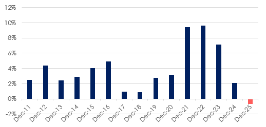 Three further regions – East of England (0.5%), South West (0.7%) and Scotland (0.5%) – saw growth below 1.0% in 2025. Their current trajectory suggests that these regions could tip into recording falls in early 2026.