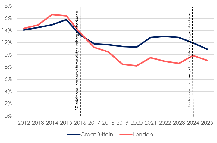 Landlord activity continued to slide in 2025, with just 10.9% of properties in Great Britain bought by landlords, down from 12.0% in 2024 and well below the 15.8% recorded in 2015, before the 3% stamp duty surcharge was first introduced in 2016.  This marks the lowest share since our records began in 2012 and the first time it has fallen below 11.0% over a full calendar year.  The decline comes during the first full year in which landlords paid the higher 5% stamp duty surcharge.