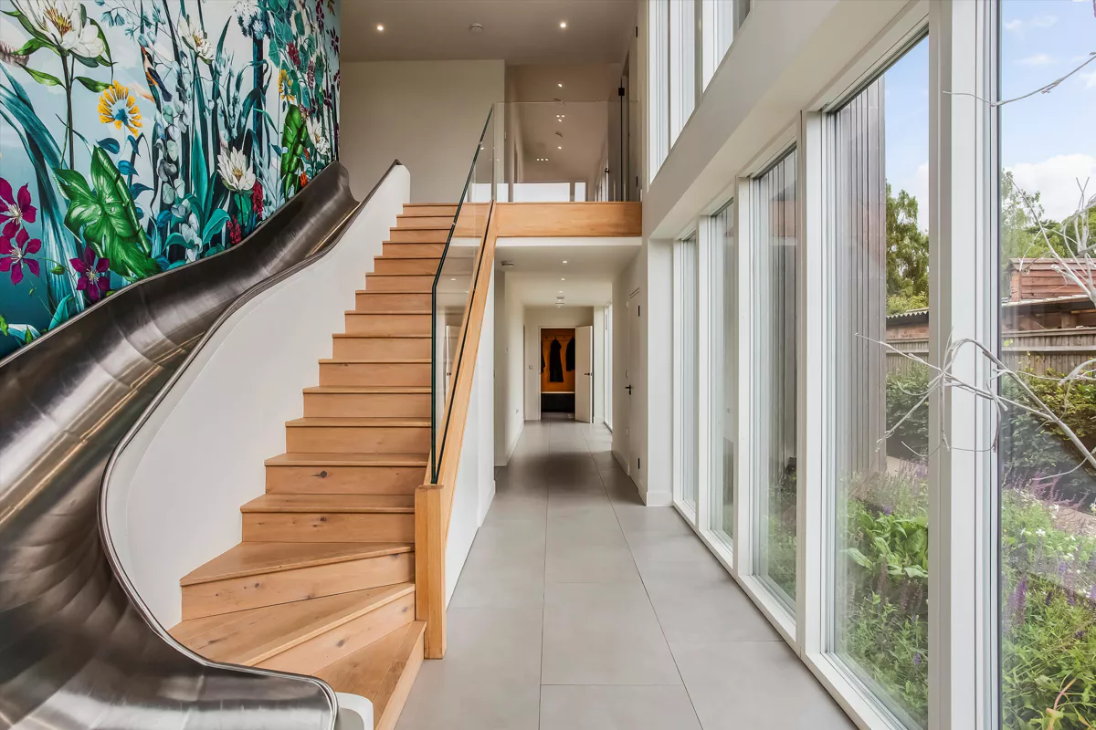 As you might expect, there is lots of glass, white walls, high ceilings etc. But it’s the staircase that caught our attention, for next to it there is a proper slide. What a fun way to effect a quick descent. Only downside might be if someone shoots off the end just as granny is toddling by with a cuppa…