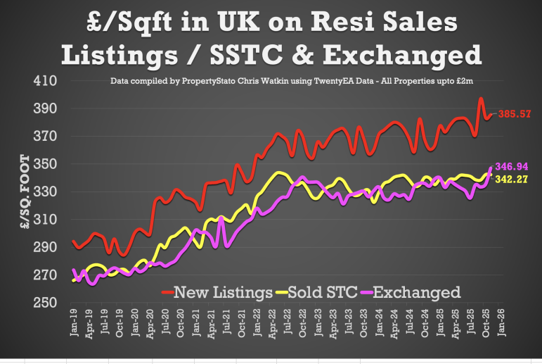 + November 2025 agreed sales averaged £342.27 per sq.ft. 0.7% higher than 12 months ago and 12.6% than 5 years ago. The £/sqft at sale agreed matches the HM Land Registry Index with a 98% accuracy, 5 months in advance. That is why it is so important. November figures will follow in next weeks show.