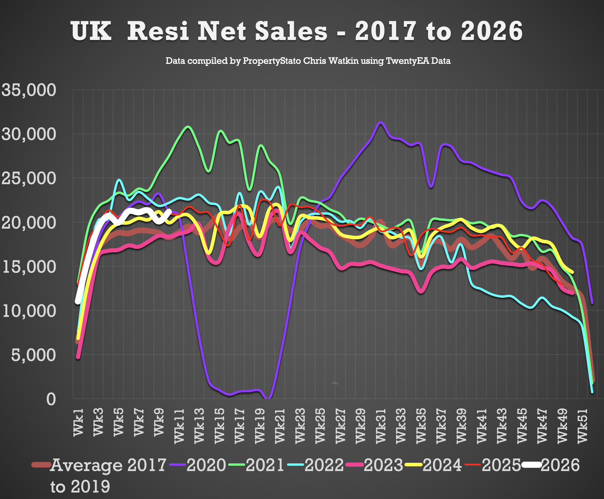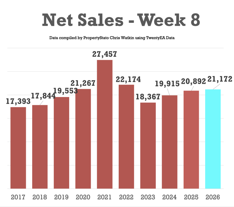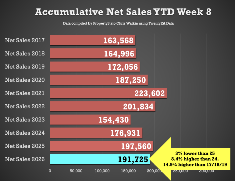 192k UK net home sales YTD (Net Sales being Gross sales less Fall Thrus). 4.5% lower than 2025, 8.6% ahead of 2024, 24.2% ahead of 2023 and 14.9% above the 2017–19 average.