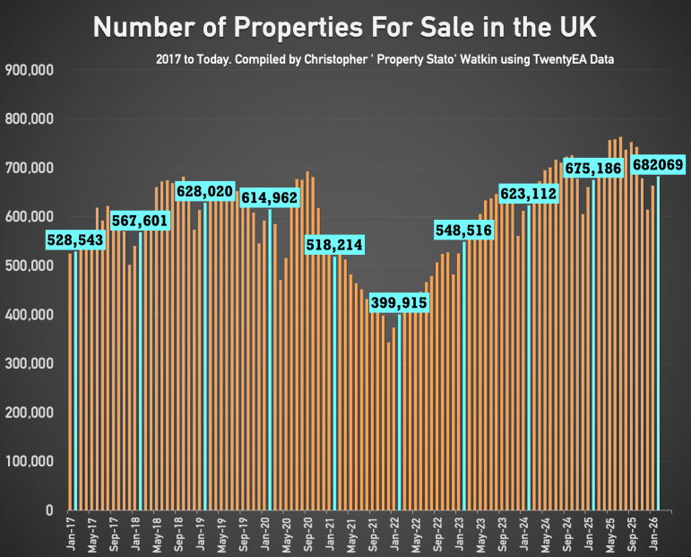 • 682k homes on the market on the 1st of March ’26. (675k – 1st March 25)