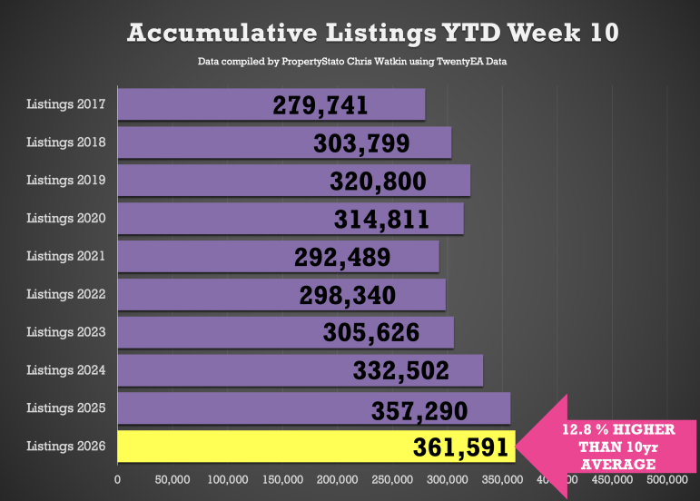 362k new properties have come onto the market YTD , 1.2% ahead of 2025, 8.7% above 2024, and 20% higher than the 2017–19 average.