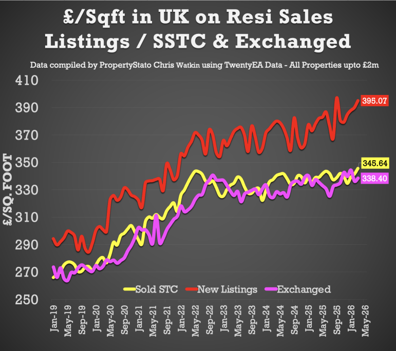 • March ’26  agreed sales averaged £345.64 per sq.ft. 2% higher than 12 months ago (£338.97) and 12.7% than five years ago (£306.76). The £/sqft at sale agreed matches the HM Land Registry Index with a 98% accuracy, five months in advance. That is why it is so important.