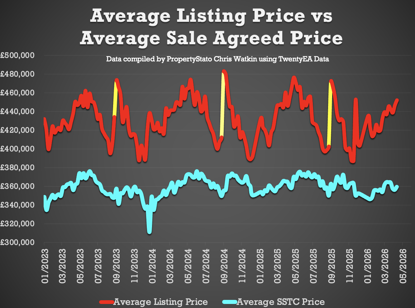 • 25.8% difference (long term 10 year average is 16% to 17%). (£451k ave Listing Ave Asking price vs £359k Sale Agreed ave Asking price).