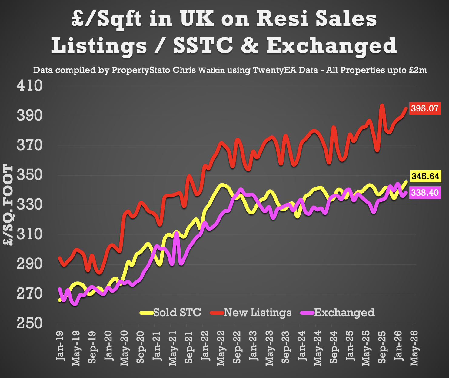 • March ’26 agreed sales averaged £345.64 per sq.ft. 2% higher than 12 months ago (£338.97) and 12.7% than 5 years ago (£306.76). The £/sqft at sale agreed matches the HM Land Registry Index with a 98% accuracy, 5 months in advance. That is why it is so important.