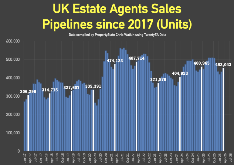 • 453k homes in agent’s sales pipeline on the 1st April 2026, slightly lower than 12 months ago on 1st April ’25 (461k).