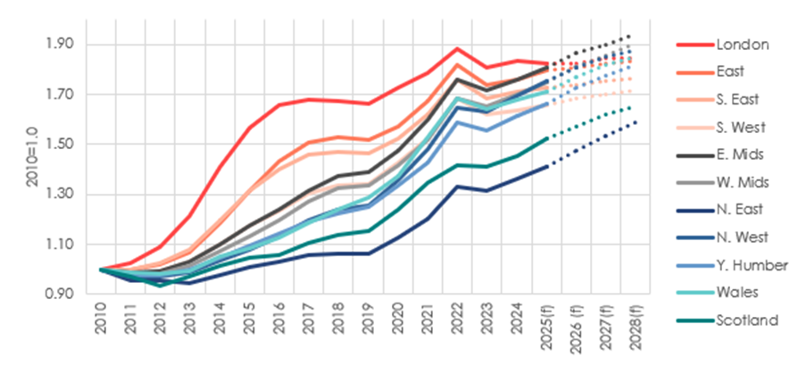 Over the four-year forecast period, the North East is set to see the strongest growth (16.4%), followed by Scotland (13.6%) and Yorkshire & The Humber (12.5%). These regions have seen some of the weakest growth since 2010, so this acceleration marks a catch-up phase.