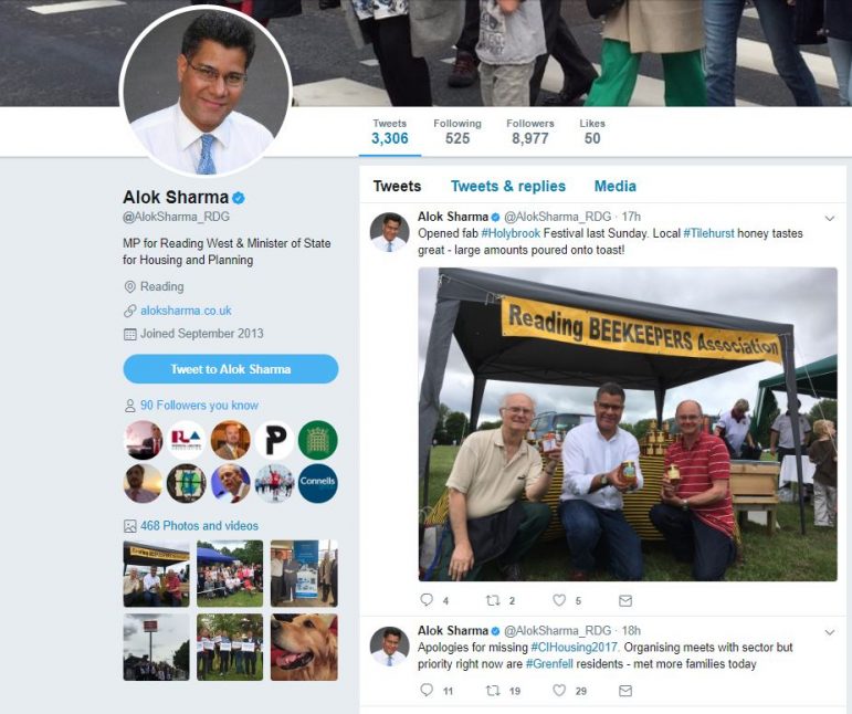 One tweets about beekeeping and the other actually mentions housing, so it may be hard to tell which of the below Twitter profiles of Alok Sharma is real and which is a spoof.